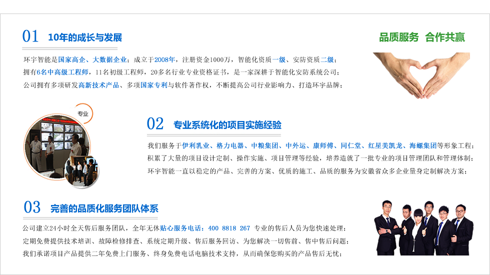 合肥市環(huán)宇智能工程有限公司成立于2008年,科創(chuàng)版上市企業(yè),現(xiàn)注冊(cè)資金1000萬(wàn)整,電子與智能化系統(tǒng)集成資質(zhì)壹級(jí),安防資質(zhì)級(jí),是“國(guó)家高新技術(shù)企業(yè)”、“合肥市高新技術(shù)產(chǎn)品認(rèn)定企業(yè)”、“安徽省安防協(xié)會(huì)會(huì)員單位”、“AAA級(jí)信用等級(jí)認(rèn)證企業(yè)”、“AAA級(jí)重合同守信用企業(yè)”、“合肥市創(chuàng)新型企業(yè)”、是行業(yè)領(lǐng)先的智能化整體解決方案的集成商